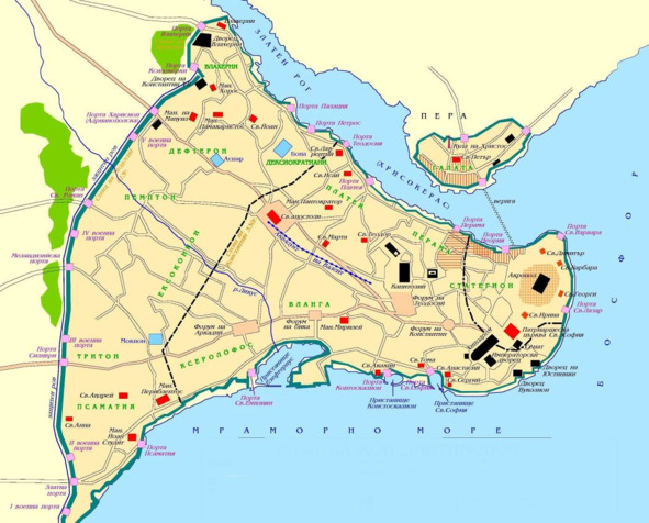 То же самое могло произойти при прорыве стен Византия в районе Золотой палаты и прохода на Ипподром. На Ипподроме, вмешавшем 100 тысяч человек, где собирались все взрослые жители Царьграда, показывали трофеи и пленных царей, вновь вступивший на трон император впервые обращался к народу.