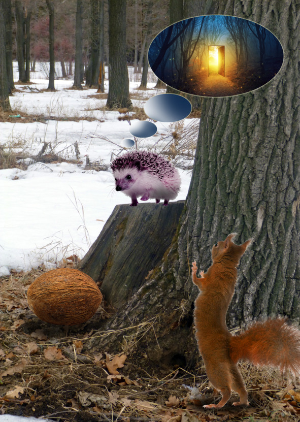 Ёжику нравились его новые друзья. Он наслаждался тёплой, комфортной обстановкой, и ему действительно казалось, что он попал в рай. Чтобы сохранить праздничное настроение, он начал свой спектакль, хотя никогда в жизни не пробовал себя в роли актера. Он очертил полный круг, встал на четыре лапы и пошёл по окружности, как по дорожке.