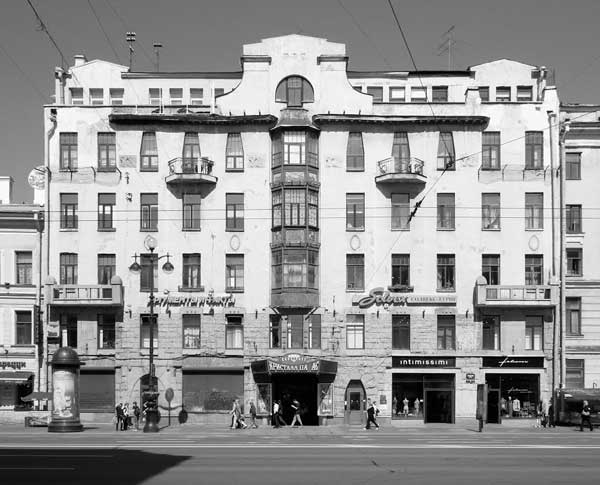 Дом большой, построен был как доходный (дом М. В. Воейковой); вполне солидный, облицован серым камнем. Как я выяснил уже в наше время, построен в 1910 году, – типичный «петербургский модерн». Расположен прямо напротив улицы Рубинштейна (до революции – Троицкая) – его все знают.