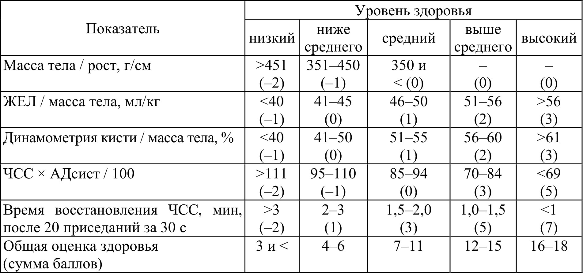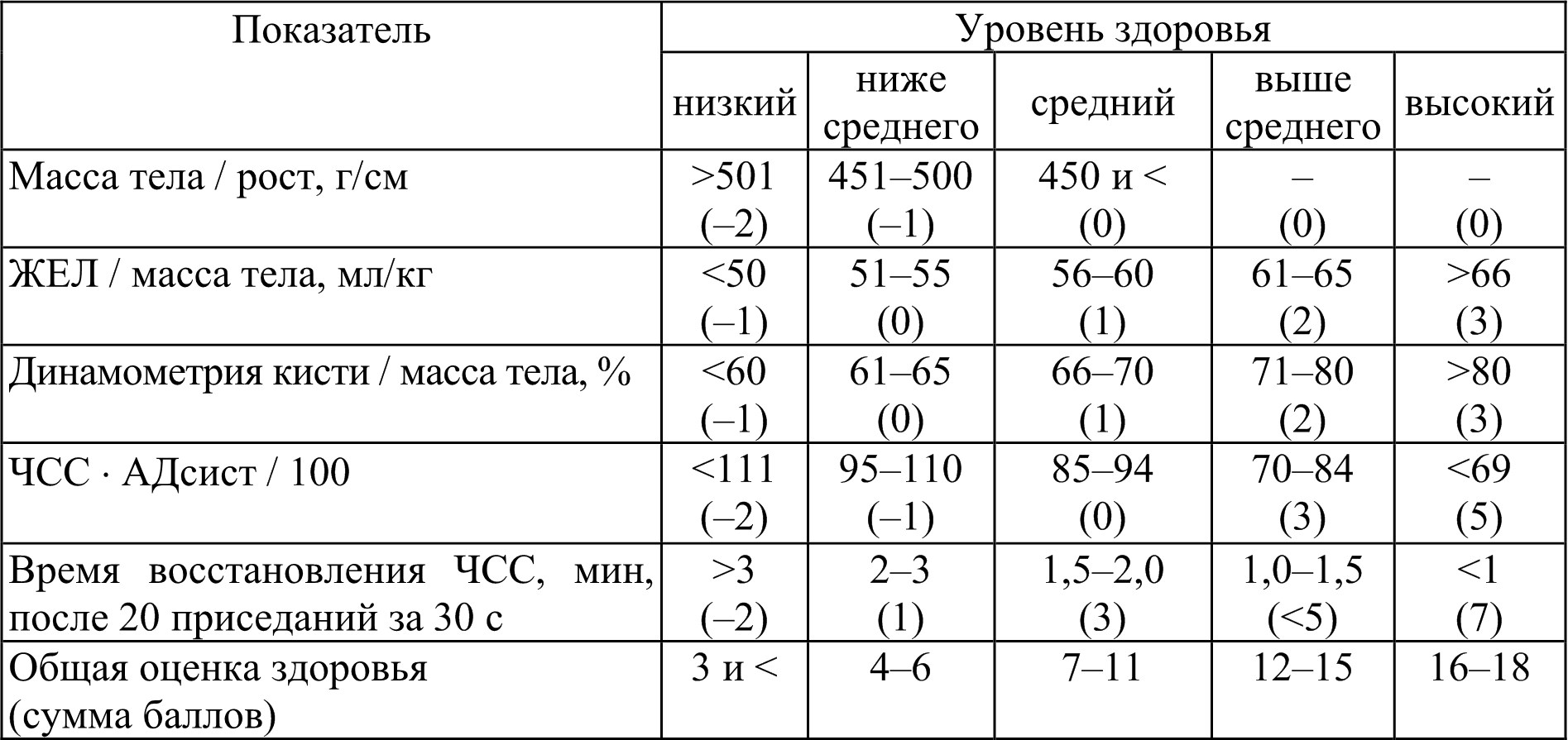 Примечание к табл. 1 и 2: в скобках – баллы; ЖЕЛ – жизненная емкость легких; ЧСС – частота сердечных сокращений; АДсист. – уровень максимального (систолического) артериального давления в покое.
