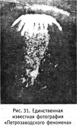 «Жители Петрозаводска явились свидетелями необычного явления природы. 20 сентября около четырех часов утра на темном небосклоне вдруг ярко вспыхнула огромная „звезда", импульсивно посылавшая на Землю снопы света. Эта „звезда" медленно двигалась к Петрозаводску и, распластавшись над ним в виде медузы, повисла, осыпая город множеством тончайших лучевых струй, которые производили впечатление проливного дождя (рис. 31).