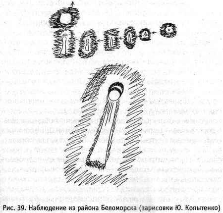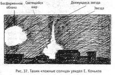 Движение ее было довольно медленным и фиксировалось мною по соседней звезде. Когда точка поднялась выше звезды, ее свечение увеличилось… и как-то сразу все пропало. Соседнего „ложного Солнца" поблизости не было. В стороне было бесформенное небольшое облако, но оно осталось и свечения не излучало…»