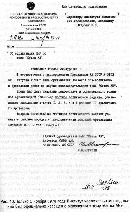 Почти полгода ушло на организационные мероприятия, и лишь распоряжением Президиума АН СССР № 0172 от 1 августа 1978 года был определен первый список исполнителей по научно-исследовательской теме «Сетка-АН». В него вошло более десятка институтов Академии наук, в том числе Государственный астрономический институт имени Штернберга, где работал Л. М. Гиндилис, Московский авиационный институт, Институт космических исследований, Институт физики Земли, Институт океанологии, Астросовет, Комитет по метеоритам и космической пыли СО АН СССР (рис. 40). Головной организацией был назначен ИЗМИРАН – Институт земного магнетизма и распространения радиоволн, который возглавлял член-корр. АН В. В. Мигулин. Со стороны военных головной организацией был НИИ-22 МО СССР, который возглавлял генерал-лейтенант Виктор Павлович Балашов. В нем была создана рабочая группа из четырех человек, которую возглавил полковник Ахат Абдуллович Абдуллин. Все взаимодействие между военным и академическим направлениями координировали два кандидата технических наук – полковник Борис Александрович Соколов из Секции прикладных проблем АН СССР и Александр Александрович Плаксин из группы Ахата Абдуллина (рис. 41).