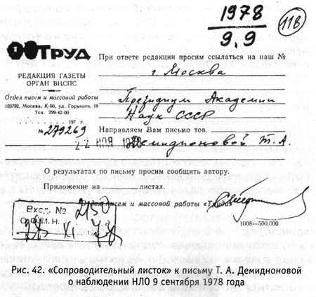 Хотя в то время еще не были выработаны новые цензурные правила, ее письмо не попало на страницы газеты. Оно было передано в Академию наук СССР с просьбой ответить автору. Судя по отсутствию отметок на «сопроводительном листке», гражданка Демиднонова ответа так и не дождалась (рис. 42).