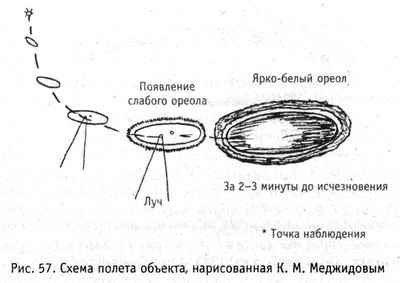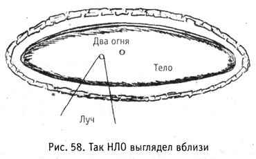 При спуске эта точка приобрела форму наклоненного под углом блюдца (напоминая собой эллипсоид; можно сравнить с метательным спортивным диском). Было ясно видно, что это материальное тело, яркого голубовато-серебристого цвета. Перед выходом на горизонтальную прямую тело увеличилось до размеров около 150 м, и в его центре я увидел два ярких огня, напоминающих по характеру своего свечения удаленные на большое расстояние автомобильные фары. От одного источника света (левого от зрителя) в направлении земли шел яркий луч, края которого были отчетливо выражены и расходились под углом около 30 градусов, а средняя часть затемнена. Луч совершал небольшие вращательные движения по окружности. У меня создавалось впечатление, что луч до земли не доставал (рис. 58). Поскольку я наблюдал за телом в очках с затемненными стеклами, мне казалось, что луч розоватого оттенка (товарищи, также наблюдавшие указанное явление, утверждали, что свет был ярко-белый).