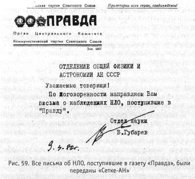 В редакцию «Правды» после публикации в ней 2 марта 1980 года антитарелочной статьи В. Губарева «Легенда о пришельцах» пришло множество писем. Все они были переданы в «Сетку» (рис. 59). Среди них были не только рассказы о наблюдениях НЛО в небе, но даже истории о контактах. Вот одно из них («Сетка-АН», сообщение 711):
