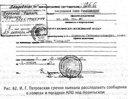 Видели НЛО все жители – рабочие Мессоярки. Записаны сотни метров магнитной пленки разговоров пилотов, диспетчеров аэропортов, военных, дежурных КГБ. Здесь сейчас работают астрофизики и другие товарищи (рис. 62).