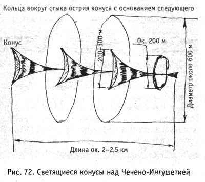 В период с 22 по 26 июня 1976 года (очевидец точно не запомнил) над Грозным, в 22.10, появилось гигантское тело, наклоненное по отношению к земле на 15 градусов. Оно летело на высоте около 300 м до нижней части кольца со скоростью около 120 км/ч. НЛО светился равномерным зеленым светом. По всей длине конусов свечение сопровождалось более яркими пульсациями, которые перемещались, переходя с одного конуса на другой. Их яркость менялась в зависимости от кривизны поверхности, по которой они перемещались. В месте стыка конусов при их подходе происходила яркая вспышка, и в этот момент кольцо вибрировало. Никаких звуков при этом не было, но пролет НЛО сопровождался мощными эффектами: погас свет, остановилось несколько автомашин (рис. 72).