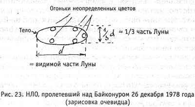 26 декабря 1978 года, в 5.00 утра, группа из пяти инженеров и представителей промышленности видели эллипсоидное тело, окаймленное 5-6 огнями неопределенных формы и цвета. Оно летело 1-2 минуты, затем исчезло за линией горизонта. Размеры тела превосходили в десятки раз самые яркие звезды (рис.23).