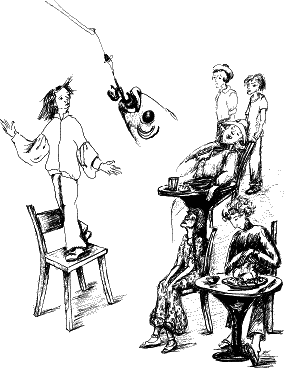 В ресторан входили новые малянцы и малянки. Повар Кастрюля лично рассаживал всех за столики. А Герадокл с Барвинкой и Кнопочкой все еще стояли у дверей. К ним подошел поэт Пёрышкин, который был завсегдатаем «Патиссона».