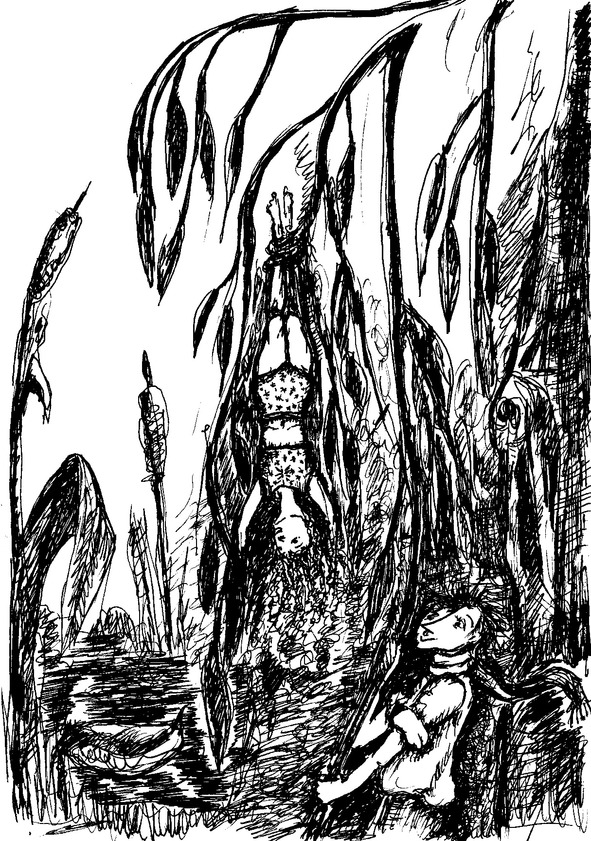 Малянка была немного тяжелее Никтошки, может быть, потому, что мокрые волосы, оплетенные тиной, тянули ее вниз. Никтошка обхватил ногами какую-то корягу и тянул лозу с такой силой, что малянка повисла, наконец, вверх ногами. Изо рта ее полилась вода, и она стала громко кашлять.