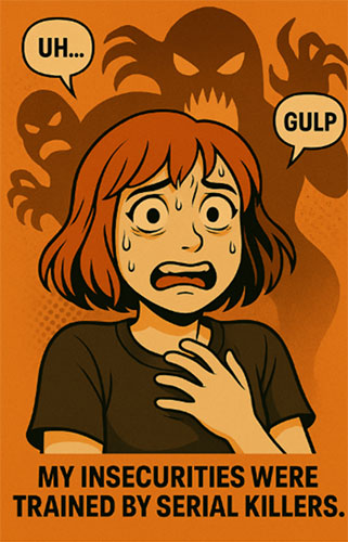 – О, ты попала в самую точку. Мои комплексы прошли тренинг у Чикатило. У меня есть чувство юмора, самоирония и харизма – но только после двух коктейлей в баре с караоке. Без апероля я – енот с тревожностью. Разговариваю неуверенно, смеюсь как ксерокс при смерти. А когда уже почти жму «Запись» – включается Джейн.