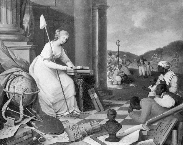 Рис. 1. Сэмюэл Дженнингс, «Свобода, демонстрирующая искусства и науки» (1790–1792). Дженнингс создал эту откровенно аболиционистскую картину, находясь в Лондоне, когда в британском парламенте шли первые дебаты об отмене рабства и было основано лондонское Общество по осуществлению отмены работорговли. Он также написал другую картину, идентичную первой, с тем исключением, что у ног богини был выставлен напоказ щит с изображением британского флага. Для Дженнингса Колумбия и Британия были взаимозаменяемыми эмблемами аболиционистской свободы в начале 1790-х годов, демонстрировавшими сохранение культурной близости между Великобританией и Соединенными Штатами, несмотря на войну. Предоставлено архивом Библиотечной компании Филадельфии