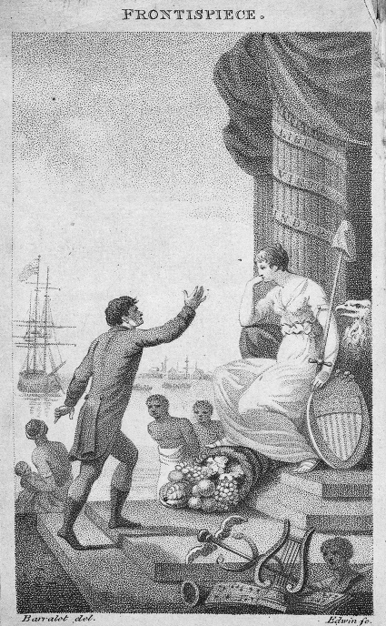 Фронтиспис «Кающегося тирана» (рис. 2) и сопроводительное описание Бренигана подвергали нападкам разительное несоответствие между политической и личной свободой Колумбии, выраженное в виде контраста между реалиями африканского рабства и проповедью американских свобод. Гравюра Дэвида Эдвина под названием «Профессиональная свобода и реальное рабство» изображала работорговца и недавно прибывших рабов, выходивших на берег и приветствовавших Колумбию, богиню Свободы. Колумбия восседает в своем храме перед колонной с надписью «Свобода, добродетель, независимость», которая, по словам Бренигана, была девизом Содружества Пенсильвания49. На тот случай, если смысл иллюстрации окажется недостаточно ясным, Брениган дает подробное объяснение: