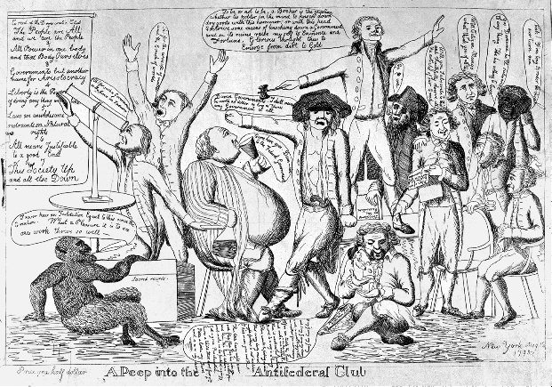 Рис. 4. «В антифедералистском клубе» (1793). Многие историки пользовались этой карикатурой для иллюстрации бескомпромиссного узкопартийного конфликта между федералистами и демократическими республиканцами. Но она также демонстрирует, насколько важную роль связующего звена в этих политических распрях, где вопрос рабства занимал центральное место, играл театр. Джефферсон произносит монолог из «Гамлета» со своей импровизированной трибуны, а присутствие «чернокожего» мятежного раба Мунго из чрезвычайно популярной музыкальной комедии Айзека Бикерстаффа «Висячий замок» бросается в глаза. Из архива Филадельфийской библиотечной компании