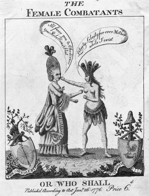 Рис. 5. «Женский поединок» (1776). Этот британский эстамп показывает, что даже некоторые британцы представляли американские колонии как индейскую вотчину: Колумбия с обнаженной грудью агрессивно машет кулаком в сторону пышно разодетой элитарной Британии в высоком парике. Опубликовано с разрешения Библиотеки Льюиса Уолпола, Йельский университет