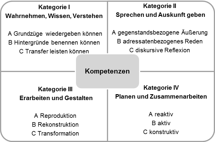 Einige Studienseminare, z.B. in Verden (Niedersachsen), bereiten sehr präzise auf die Formulierung der Kompetenzniveaus und auch deren Evaluierung während des Referendariats vor dem Zweiten Staatsexamen vor. Dafür wird die Kompetenzformulierung von Kessler und Ziener (2004) hinzugezogen, die in Abbildung 3 dargestellt wird. Kessler und Ziener haben für alle Fächer vier Anforderungsbereiche für die Kompetenzformulierung mit Bezug auf die Bildungsstandards herausgearbeitet: Die Kategorie I „Wahrnehmen, Wissen und Verstehen“ (Kessler & Ziener, 2004:1) wird dem kognitiven Bereich, Kategorie II „Sprechen und Auskunft geben“ (ebd.) dem kommunikativen Bereich, Kategorie III „Erarbeiten und Gestalten“ (ebd.) dem methodisch-kreativen Bereich und Kategorie IV „Planen und Zusammenarbeiten“ (ebd.) dem personalen und sozialen Bereich zugeordnet.