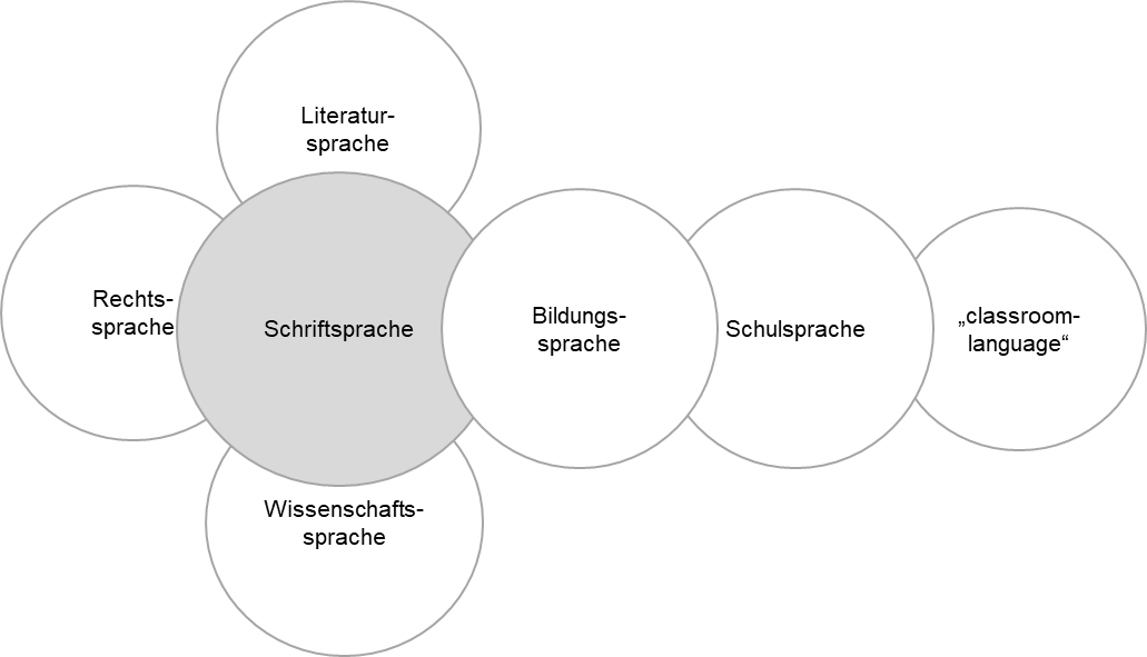 Ein Grund für die Komplexität des Überarbeitens ist u.a. die Sprache selbst, denn die Schulsprache steht im Spannungsfeld zwischen Bildungssprache, Schriftsprache sowie weiteren Sprachfeldern (Feilke, 2012a, siehe Abb. 8).
