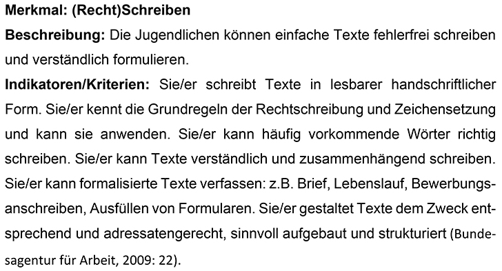 Schulerfolg ist mit einer „[…] adäquaten Beherrschung der deutschen Sprache verbunden. Sie ist das Kommunikationsmedium in und mit der Mehrheitsgesellschaft“ (Steinmüller, 2006:322). Schreiben wie auch Lesen und Rechnen sind basale Anforderungen und Kompetenzen, die institutsgebunden und für die sogenannte Ausbildungsreife unumgänglich sind (Neumann, 2010:13). Für den Schulabschluss jeglicher Schulform sind diese Kompetenzen die Eintrittskarte in die Sekundarstufe II und damit auch für viele Schüler in die berufliche Ausbildung. Sowohl die Schreibkompetenz als auch die Textsortenkompetenz (siehe Kapitel 2.4) sind laut Bundesagentur für Arbeit Einstellungsvoraussetzungen, die zum Merkmal (Recht-)Schreiben folgende Kriterien verlangt (Bundesagentur für Arbeit, 2009:22, siehe Abb. 7):
