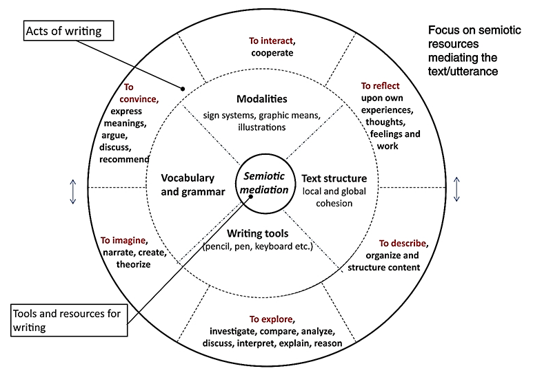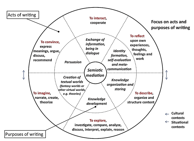 Die Abbildung 5 wird wie folgt gelesen: Der äußere Ring konzentriert sich auf die sechs Schreib- bzw. Sprachhandlungen to interact, to reflect, to describe, to explore, to imagine und to convince. Der mittlere Ring fokussiert sechs Schreibzwecke: Persuasion oder Knowledge development sind nur zwei Beispiele. Das Rad wird wiederum durch die semiotische Vermittlung zusammengehalten. Es ist kulturellen und situativen Kontexten ausgesetzt und wird von diesen beeinflusst. In der folgenden Abbildung 6 des Wheel of Writing sind der äußere und innere Ring gleich, der mittlere Ring hingegen fokussiert vier tools and resources for writing.