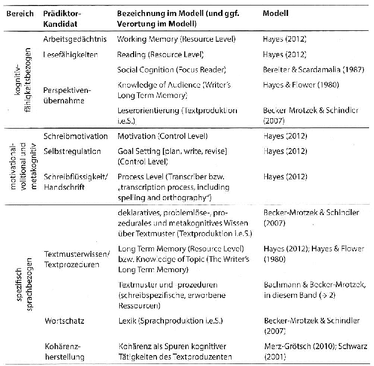 Folglich beeinflussen mehrere Faktoren die Schreibkompetenz und damit verbunden die Textqualität und können somit als Prädiktor wirken, wie die folgende Definition und die dazugehörige Abbildung 4 verdeutlichen und meines Erachtens gut zusammenfassen, da sowohl die grundlegenden Schreibmodelle als auch die dazugehörigen Prädiktoren in Beziehung gesetzt werden. Die Bereiche Volition, Motivation und Metakognition verknüpfen sich mit der Schreibmotivation und Selbstregulation, die für diese Arbeit tragend sind: