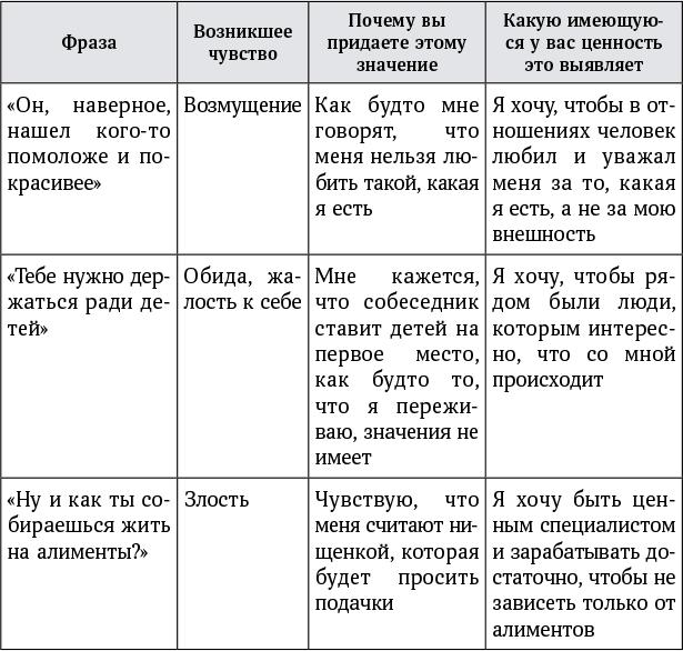 Иными словами, чувства указывают на ценности, которых вы придерживаетесь. Попробуем же их выявить. Результаты этого упражнения пригодятся, когда мы будем формулировать те принципы, на которых вы будете строить свои дальнейшие отношения.