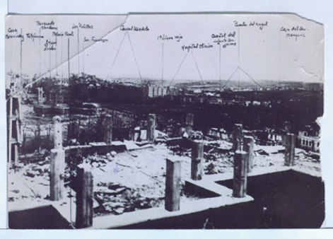 Figura 1: En esta postal percibimos la cercanía entre los dos frentes al advertir la proximidad del Hospital Clínico: baluarte tomado por las tropas franquistas desde los primeros momentos del asedio, denominado «1.ª línea roja». Fuente: AGA, F/880-01-008.