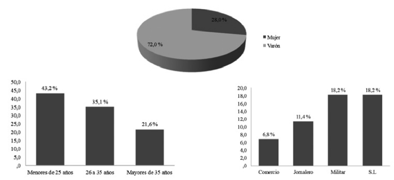 Nos interesaba también conocer el semblante humano de las víctimas. Por ello recabamos datos acerca de su identidad: género, lugar de residencia, profesiones, edades, etc. Lo primero que advertimos es que el recuento de las víctimas arroja una cifra para la zona, aproximadamente un centenar, que nos pareció menor al esperado según la información recabada en otras fuentes. Además, la mayoría de las victimas sobrevivieron; solo un 16,3 % falleció. En cuanto al género, la mayoría eran hombres y militares, dada la cercanía de la calle al frente, siendo muchas víctimas población joven, como advertiremos en los gráficos mostrados a continuación. Del mismo modo, un porcentaje elevado de las víctimas eran amas de casa y sirvientas, abundantes en la zona de estudio.