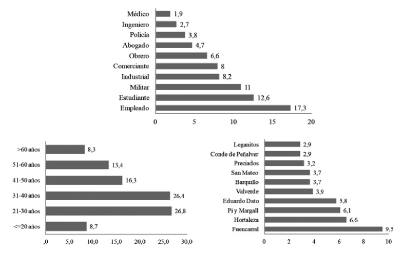 Con relación al estudio realizado por Cervera, para el conjunto de la ciudad de Madrid podemos extraer las siguientes conclusiones: respecto a las profesiones de los detenidos, en gran medida coinciden. No obstante, destacamos el grupo de estudiantes, muy numeroso por la cantidad de pensiones existentes en la zona de estudio. Sin embargo, encontramos pocos sacerdotes, grupo elevado como detenidos en las checas de Madrid.
