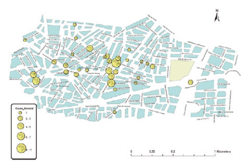 Figura 4: Plano de la zona objeto de estudio en el que se indican los lugares en los que impactaron obuses, así como la magnitud de las personas impactadas. Fuente: elaboración propia.