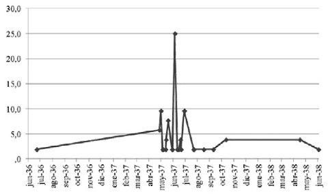 Figura 3: En este gráfico podemos advertir con mayor claridad que los picos corresponden a los meses de mayo y, sobre todo, junio de 1937. A partir del año 1938, las cifras son insignificantes. Estos datos se tienen que relacionar con la marcha de la guerra en general para extraer conclusiones sobre los momentos más duros vividos por la población madrileña en el constante asedio al que se vio sometida su población durante la Guerra Civil española. Fuente: elaboración propia a través de los datos recogidos en el apartado de «Tribunales Populares» en el Centro Documental de la Memoria Histórica.
