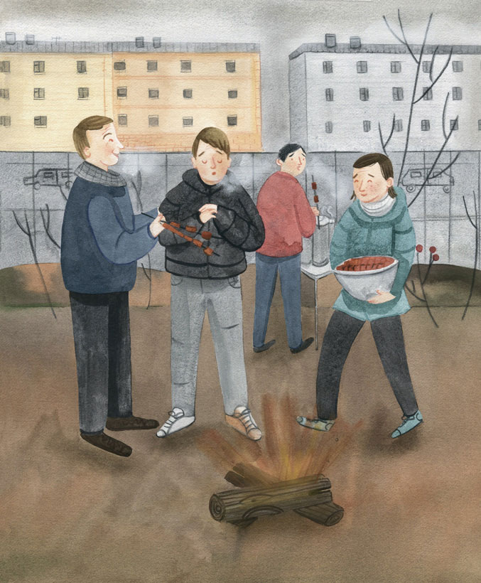 Я спросил, есть ли тут кто-то, кроме нас. В ответ Михаил лишь рассмеялся. Я понимал, что это будет совсем не такой пикник с барбекю, как те, к которым я привык дома. Когда все было устроено, Аарон достал припасы, и мы принялись готовить еду. Угли горели, а меня пробирал холод. Я стоял около маленького костерка, пытался согреться, но мне никак это не удавалось. Пикник мне нравился, мороз – нет.