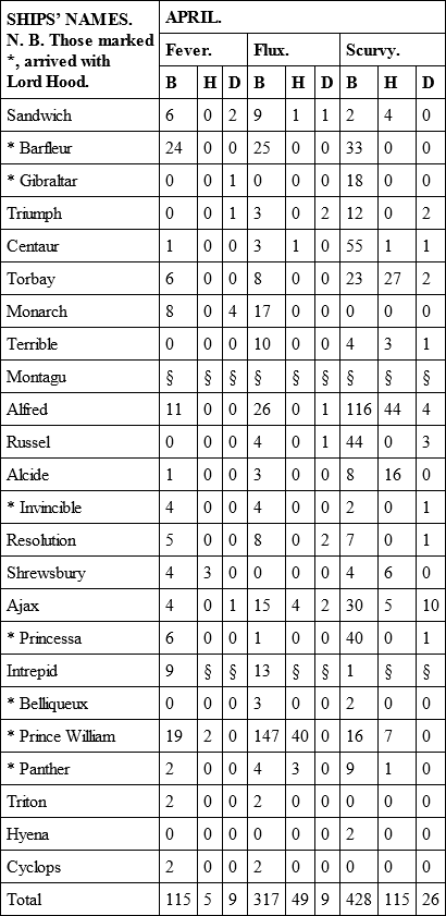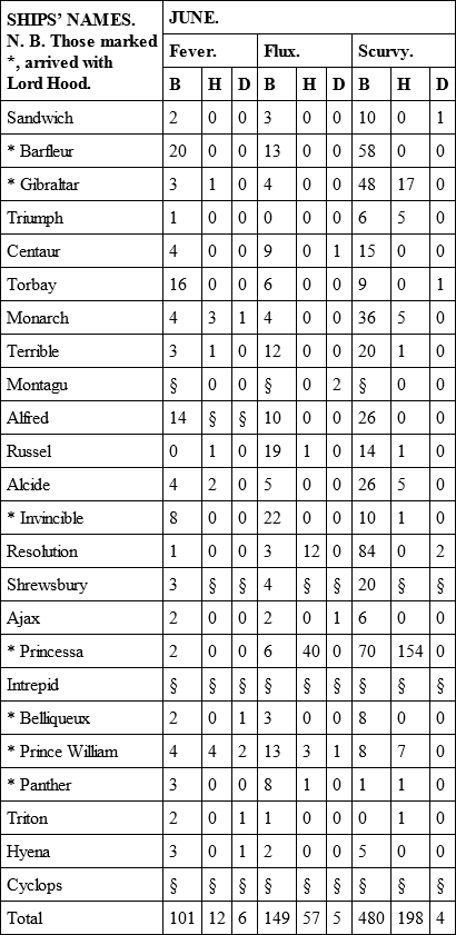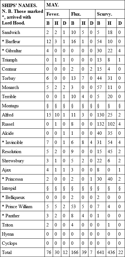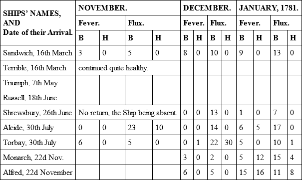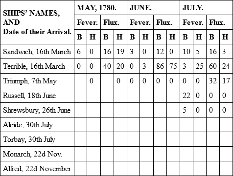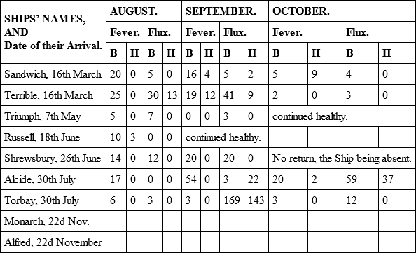 The only material alteration in point of health was in the Alcide and Torbay, which had arrived from England with a few men ill of fevers; but in the course of this voyage these two ships became as unhealthy as any that ever came under my observation. There was a greater number of sick on board of them than all the fleet besides, and it increased to such a degree, that upon their arrival at New York, which was in the middle of September, after a passage of three weeks, near one half of their men were unfit for duty. In the Alcide it was a fever that raged; in the Torbay it was a dysentery; and the unusual degree of sickness and mortality which appears in the Table for the month of September, was owing to the very sickly state of these two ships.