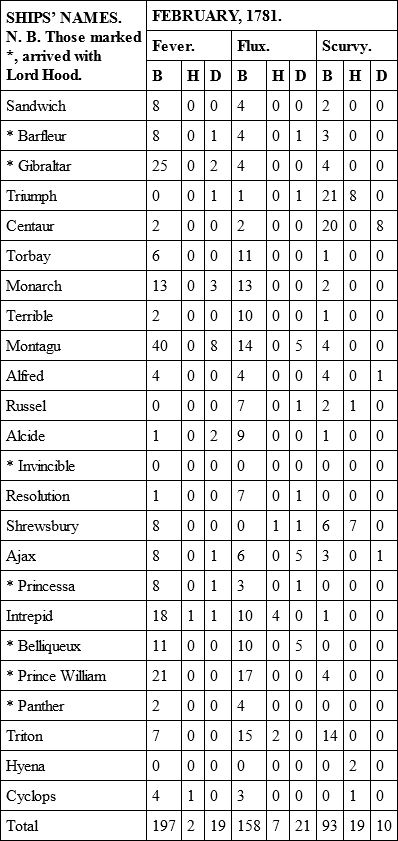 Account of the Health of the Fleet from January, 1781, till July, 1781, both Months included. – Arrival of seven Ships of the Line from England – Increase of Sickness in consequence of a Descent on St. Vincent’s – Long Cruise to windward of Martinico – Great Prevalence of Scurvy – Difference of Health in different Ships – New Ships not more unhealthy than others – Why Frigates are more healthy than Ships of the Line – Remarkable Cure of Scurvy in two Ships – Essence of Malt – Vegetables most antiscorbutic in their natural State – Advantage of supplying Refreshments on board of Ships in preference to Hospitals.
