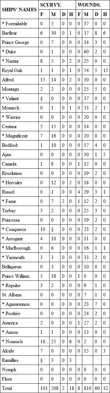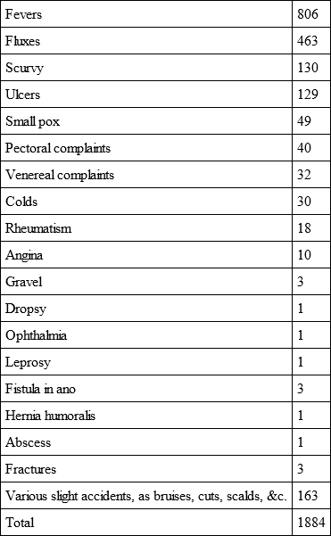 In order to show more fully and minutely what are the complaints incident to fleets in this climate, I shall set down a list of the numbers taken ill of the different diseases and accidents during this month, extracted from the returns of twenty-eight ships of the line, and two frigates.
