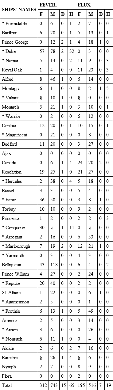 It appears, from comparing the Tables of this month with those of the preceding, that there had been a great increase of fevers and fluxes, particularly of the latter. The fevers prevailed chiefly in the ships lately from England, especially the Fame and Conqueror. In the Duke there were a great number ill of fevers; but this ship not having arrived from England till after the first of the month, is not included in the calculation. The fluxes were most prevalent in the ships we found on the station, particularly the Canada, Resolution, and Nymph frigate. The scurvy had increased very little, but prevailed most in the ships we found here. The only ships of the new squadron that had this disease to a considerable degree, were the Conqueror and Nonsuch. The former had indeed a good many ill of it; but the return having been made in an imperfect manner, this ship is not included in the calculation.