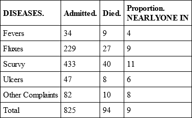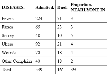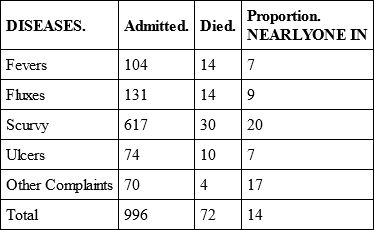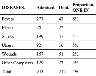 24This comprehends not only the deaths in the time the fleet remained there, but all that happened afterwards. The mortality, from wounds and ulcers, is greater than might be expected in so fine a climate, and at the coolest season of the year; but as the place was then besieged, the sick and wounded could not be supplied with those refreshments that were necessary to the recovery of the men, and wounds and ulcers are complaints very apt to be affected by the quality of the diet.