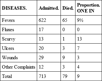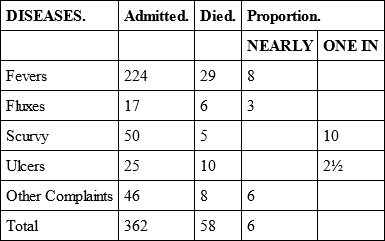 It happened on this, as on the former occasion, that none were sent on shore but such as were very ill, or had contagious complaints, the rest being provided with refreshments on board of their ships. There were no wounds at this time, but there was a greater proportion of fevers; so that the complaints, upon the whole, might be said to be about equally dangerous. The mortality now was, however, considerably less, and this is to be imputed to the more favourable situation of the hospital, which I did not allow to be overcrowded; and the men had all manner of justice done them in point of attendance and accommodation.