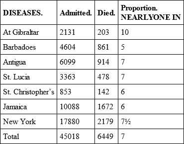 Hospital at Gibraltar, 1780 – at Barbadoes, 1780 – Causes of Mortality from various Diseases – Accidents – the Hurricane – Wounds – Amputations – Scorches – Fluxes very apt to arise at the Hospital – Proportion that were received and died at Antigua – St. Christopher’s – St. Lucia, and at Barbadoes, 1782 – at Jamaica, 1782 – at New York, Autumn, 1780 – 1782 – General View of the Admissions and Mortality at all the Hospitals during the War.