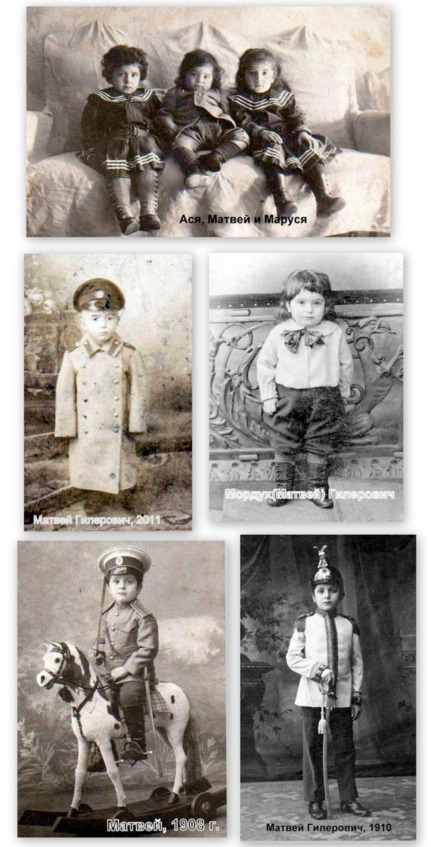 Мой отец, Гилерович Матвей Михайлович, происходил из бедной еврейской семьи. Отец – портной, мать – домохозяйка. Согласно Удостоверению, выданному ЗАГС Коломенского района города Петрограда на основании представленных документов «у граждан Хамма Берковича и Веры Янкелевны, супругов Гилерович, имеется сын Мордухай Гилерович, родившийся шестого ноября тысяча девятьсот четвертого года». Пишу я об этом, потому что это единственный документ, не считая двух детских фотографий, сохранившийся в семье. После смерти моей тети Маруси ее «воспитанница» Татьяна Приходько передала старый сафьяновый альбом с медной застежкой, в котором были фотографии родителей отца и некоторых их родственников. Конечно, никаких записей не было. По отдельным заметкам на обратной стороне пытаюсь восстановить генеалогическое древо хотя бы с этого момента