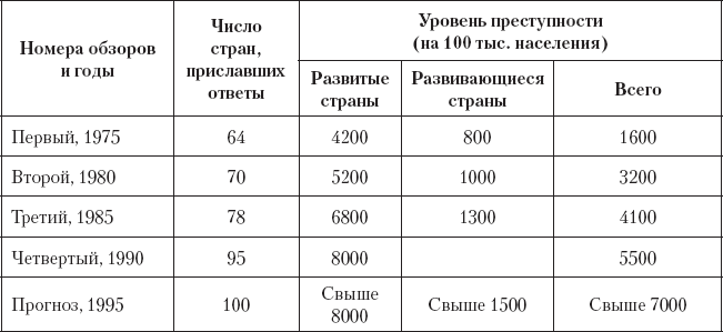 В целом уровень общей преступности (на 100 тыс. населения) во всем мире повысился с 2500 в 1980 г. до 3100 в 2000 г.; в Северной Америке снизился с 8900 в 1991 г. до 6000 в 2000 г.; в странах Европейского союза этот показатель возрастал с 5000 в 1980 г. до 6200 в 1994 г. с последующей стабилизацией, сокращением до 6000 в 1998 г. и вновь небольшим повышением до 6200 к 2000 г.; в странах Латинской Америки и Карибского бассейна уровень преступности волнообразно колебался: 2200 в 1980 г., 2000 в 1984 г., немногим более 3000 в 1989, 1993–1994 гг., снижение до 2800 в 1997 г., возрастание до 3500 в 1998–1999 гг. с небольшим снижением в 2000 г.