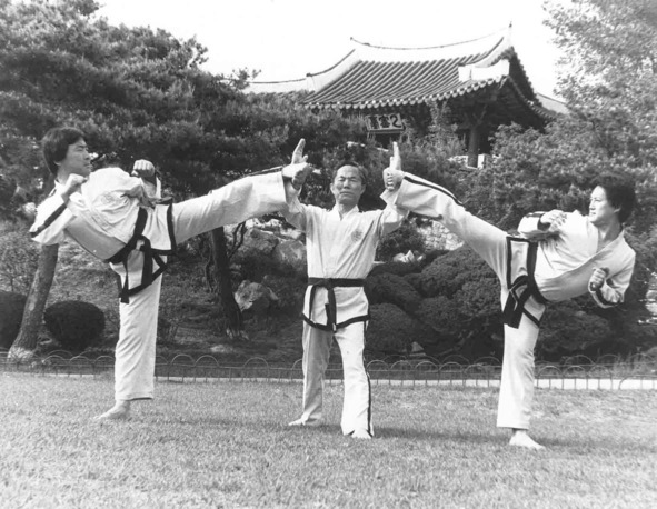 Генерал Чой защищается от ударов своего сына Чоя Джун Хва (справа) и Пака Чун Тэка, моего первого инструктора. Фото предоставлено Генералом Чоем.