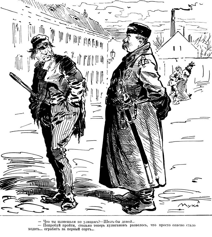 Раз был такой случай. Запутался по пьяному делу на Хитровке сотрудник «Развлечения» Епифанов, вздумавший изучать трущобы. Его донага раздели на площади. Он – в будку. Стучит, гремит, «караул» кричит. Да так голый домой и вернулся. На другой день, придя в «Развлечение» просить аванс по случаю ограбления, рассказывал финал своего путешествия: огромный будочник, босой и в одном белье, которому он назвался дворянином, выскочил из будки, повернул его к себе спиной и гаркнул: «Всякая сволочь по ночам будет беспокоить!» – и так наподдал ногой – спасибо, что еще босой был, – что Епифанов отлетел далеко в лужу…