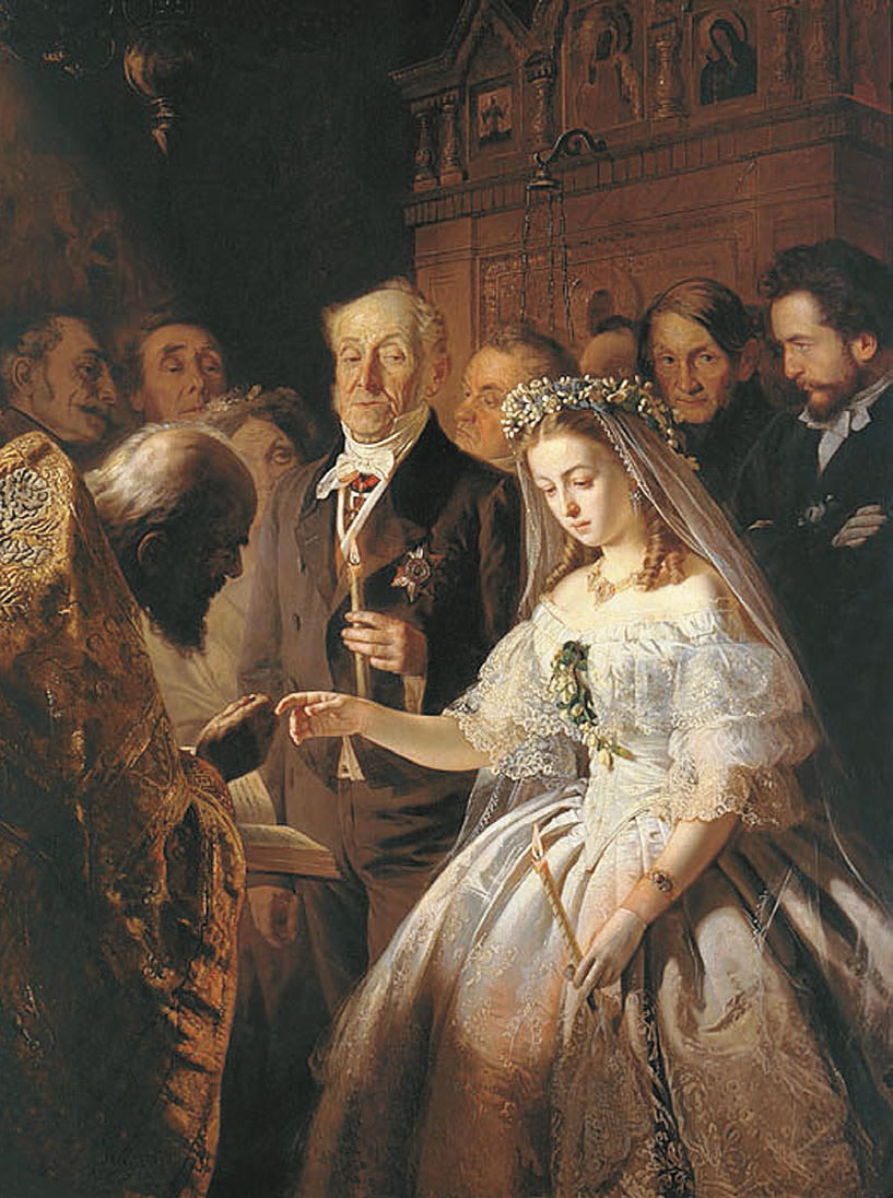 Картина В. Пукирева «Неравный брак» наделала много шума. Москва полнилась слухами, история создания картины обросла легендами. Все гадали – кого же все-таки изобразил художник: свою невесту или чужую, если чужую, то чью именно. Гиляровский придерживался распространенного в то время мнения, что молодая девушка – невеста В. Пукирева. Однако… Есть и другая версия, согласно которой, юная невеста – это возлюбленная друга живописца Сергея Михайловича Варенцова Софья Николаевна Рыбникова. Девушка, повинуясь воле родителей, вышла замуж за состоятельного купца Андрея Александровича Корзинкина, человека рассудительного, но доброго и мягкого. Ради справедливости стоит заметить, что брак оказался счастливым. Естественно замужество любимой угнетало Варенцова, и Пукирев являлся свидетелем его душевных терзаний. Оба друга, однако, присутствовали на свадьбе Софьи Николаевны и Андрея Александровича, мало того – Варенцов выступал на ней в роли шафера, поскольку его старший брат был женат на сестре жениха. Впечатлительный Пукирев увековечил эту любовную историю в своей картине, заменив 37-летнего Корзинкина на старика-генерала. Шафер, стоящий со скрещенными на груди руками, – по одной версии, Варенцов, по другой – сам автор картины, а невесту художник писал с Прасковьи Матвеевны Варенцовой, в которую был влюблен.