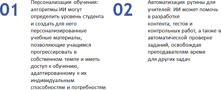 Таким образом, использование инструментов ИИ в образовательных программах способствует более эффективному обучению, персонализации этого процесса.
