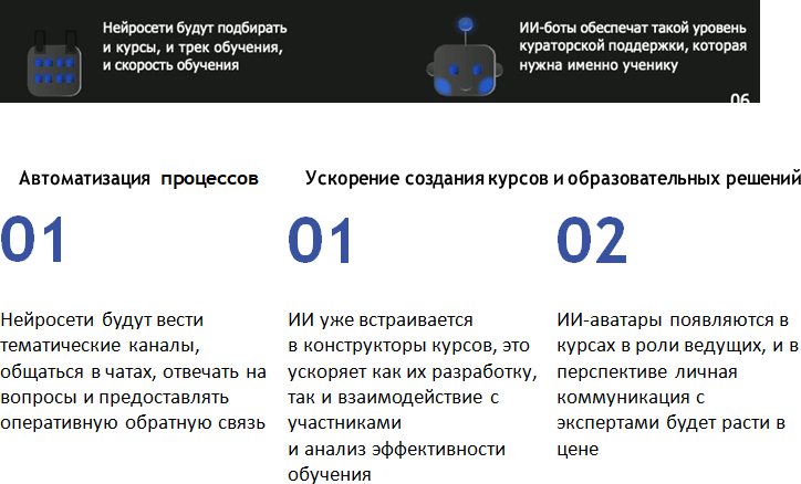 ИИ и персонализированное обучениеАдаптивное обучение получит новый виток развития. ИИ сможет подстраиваться под каждого, исходя из анализа его личности.
