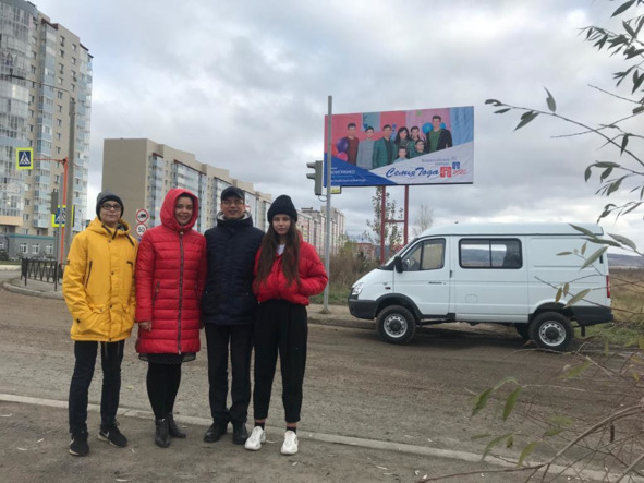 Семья Моисеенко и плакат о ее победе во Всероссийском конкурсе «Семья года 2020» в номинации «Многодетная семья». На въезде в город Сосновоборск, 11.10.2020 г.