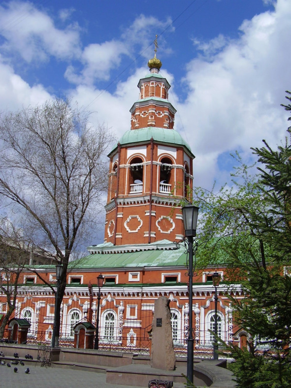 Камень в честь 150-летия В. И. Сурикова возле кафедрального собора (последний выкрашен еще в красный цвет – цвет мученичества и коммунизма). Красноярск, 2006. Фото В. Е. Гиндер.