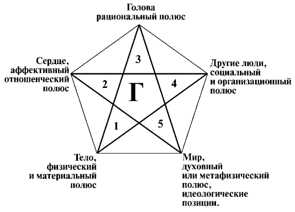 Для иллюстрации этого многомерного подхода я часто прибегаю к символическому[5] изображению с помощью пятиконечной звезды, «пентаграммы», традиционного образа человека: – с головой, двумя руками и двумя ногами.