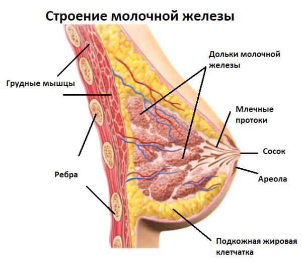 Молочная железа – это сложная система альвеолярно-трубчатых соединений (альвеол или ацинусов), образовывающих мелкие дольки и затем – крупные доли органа. В составе дольки – по 10-100 вытянутых терминальных протоков. Дольковые (лобулярные) протоки соединяются по 20–40 штук и создают связку, которая называется экскреторным протоком молочной железы. По нему происходит отток секрета (молока).